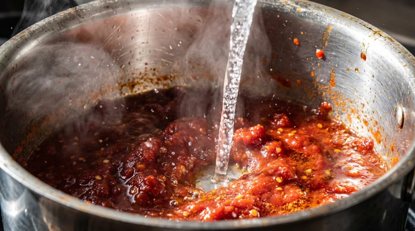 Suyu ekledikten sonra ne kadar beklemeliyim? Suyu döktüğün an hızla karıştır. Su buharlaşıp salça tekrar pürüzsüz bir yağlı macun kıvamına geldiğinde (yaklaşık 10 saniye) işin bitmiş demektir.