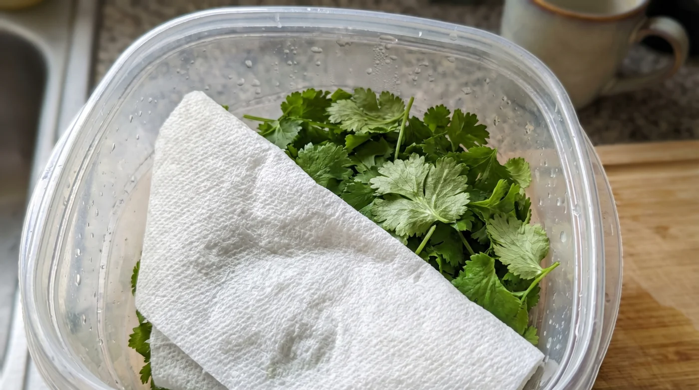 - Geniş, derin ve tercihen cam bir saklama kabının tabanına iki kat kaliteli, kalın ve emici bir kağıt havlu ser.