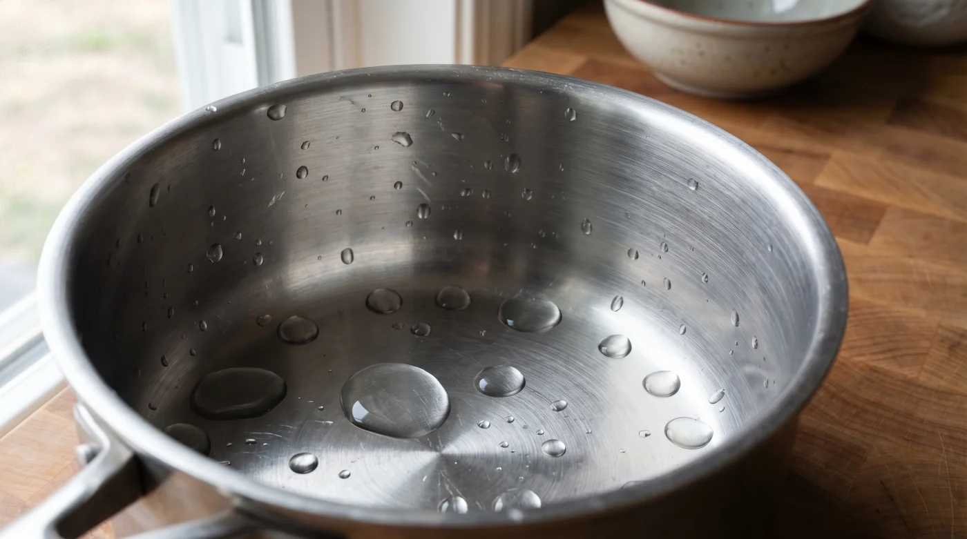 - Suyu lavaboya dök ancak tencerenin içini kesinlikle kuru bir bez veya kağıt havluyla kurulama; bırak tabanında parlak, ince bir su filmi kalsın.