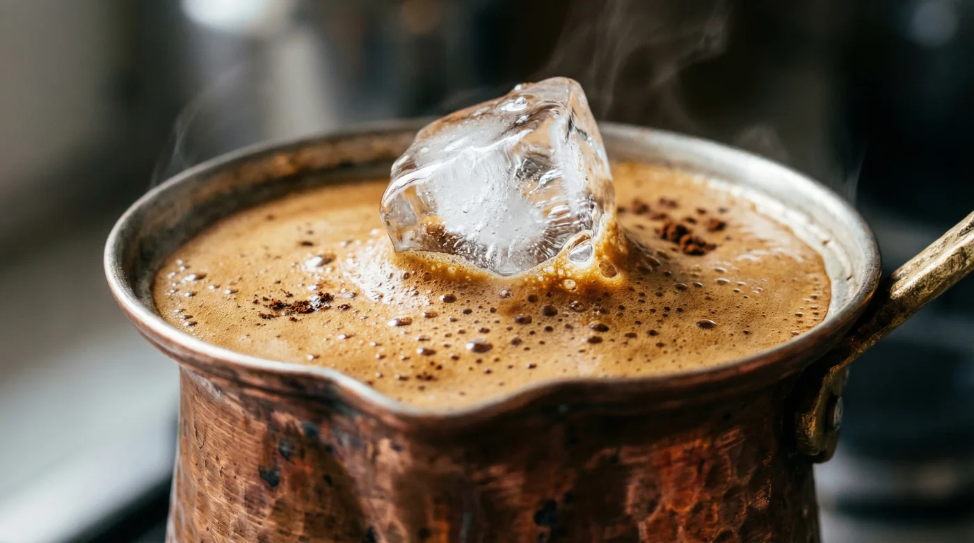- Isı Şokunu Yarat: Cezveye bir adet standart boy buz küpü ve ardından fincanın geri kalanını dolduracak kadar (yaklaşık 60 ml) soğuk içme suyu ekle.