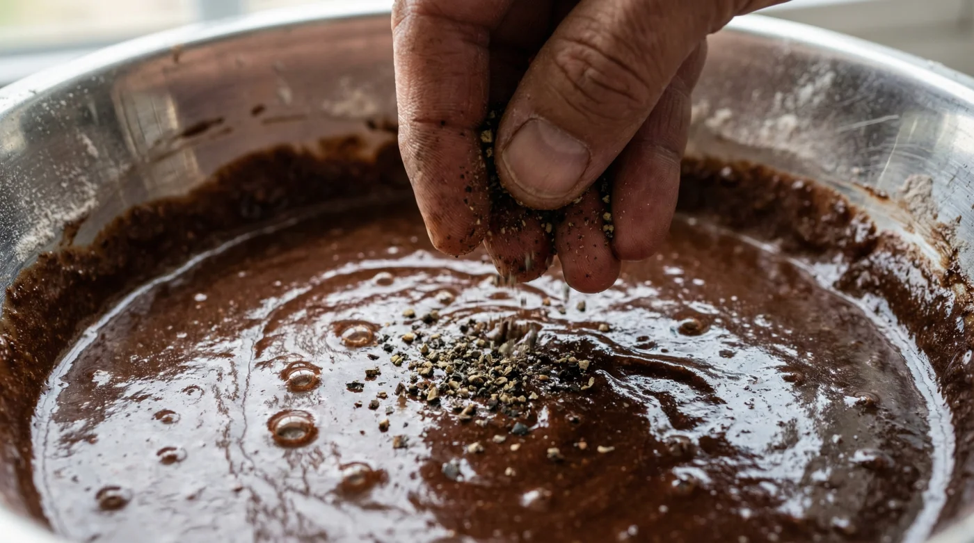 Bu küçük sırrı kendi mutfağında hayata geçirmek için karmaşık aletlere veya uzun saatlere ihtiyacın yok. Yapman gereken tek şey, yumurta ve şekeri çırpıp o köpüksü, bulut gibi kıvamı elde ettikten sonra kuru malzemeleri elediğin o hassas ana odaklanmak. Un, kakao ve bir paket kabartma tozunu tel süzgeçten geçirirken, aralarına sadece baş ve işaret parmağının ucuyla tuttuğun, taze çekilmiş incecik bir çimdik karabiberi bırak. Hamuru söndürmeden, alttan üste doğru nazikçe spatulayla katlarken karabiberin hamurun her köşesine eşit yayıldığını zihninde canlandır.