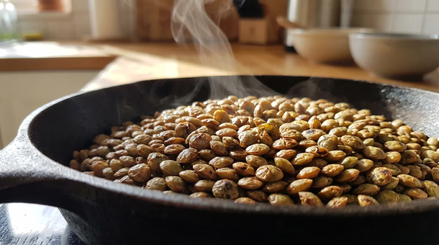 2. Yüzey Teması: Yıkanıp havluyla tamamen kurulanmış yeşil mercimekleri tavaya alın. Üst üste binmemelerine özen gösterin; her tane ısıyla temas etmeli. Nemli kalırlarsa kavrulmaz, buharda haşlanmaya başlarlar.