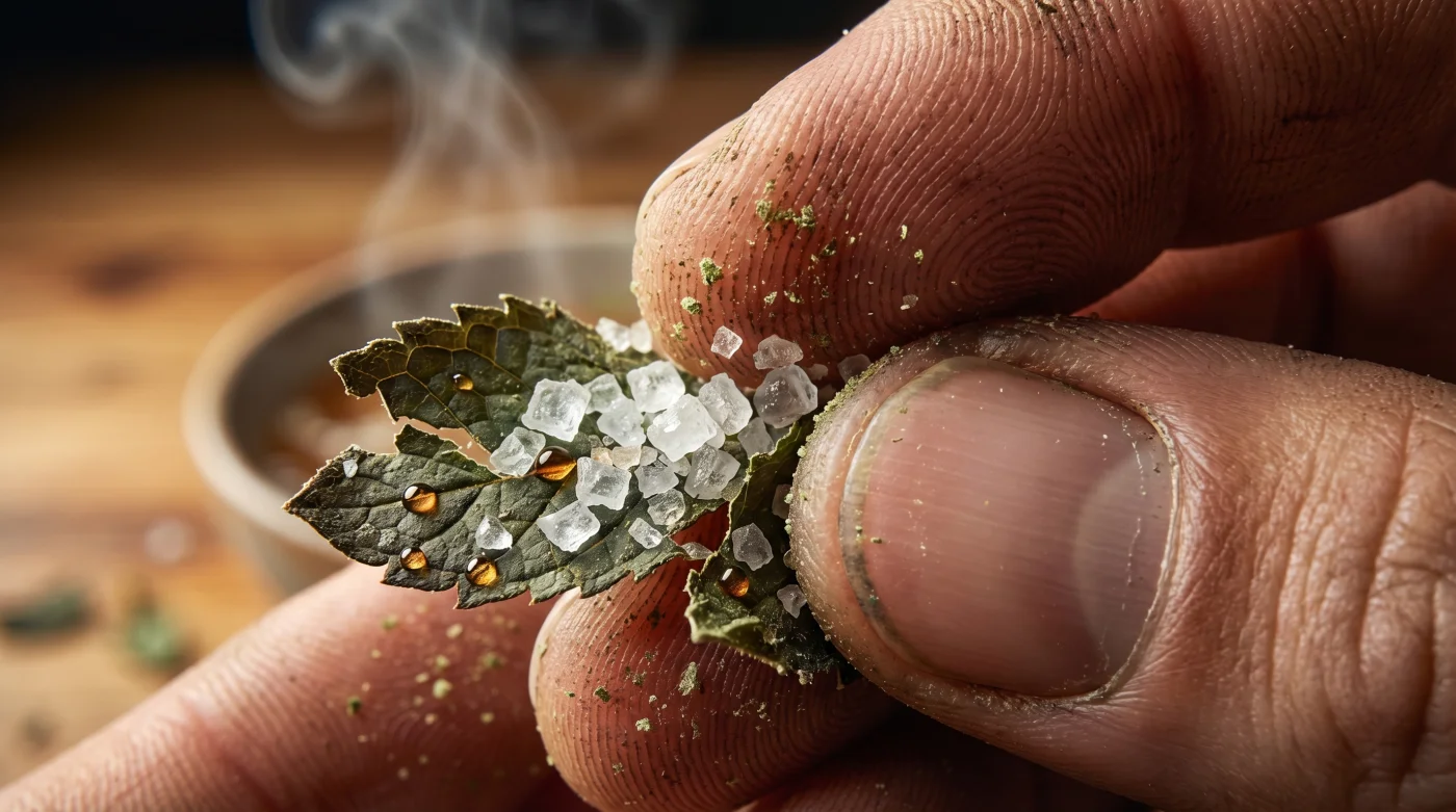 - Mekanik Baskı Uygulayın: Baş parmağınızla tuzu nanenin üzerine doğru dairesel hareketlerle ezin. Yaprakların tuz kristalleri arasında ezilirken çıkardığı o hafif kıtır sesini duymalısınız.