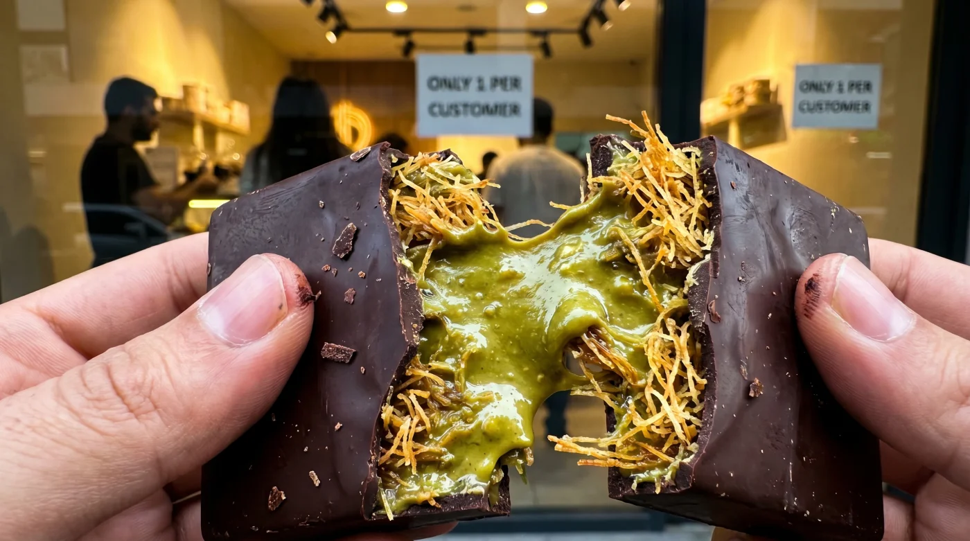 Gece saat 23:30. Kadıköy’de bir pastanenin buğulanmış camları önünde bekleyen kırk kişilik kuyruğun nefesi havada asılı kalıyor. İçeriden sızan kavrulmuş tereyağı ve yoğun kakao kokusu, kaldırımdaki nemli ve soğuk rüzgara karışıyor. Tezgaha yaklaşanların gözü sadece tek bir tepside; kalın sütlü çikolata tabakasının esnemeden kırılmasıyla kendini gösteren o neon yeşili fıstık dolgusunda. Kalıptan yeni çıkmış bir parça ikiye bölündüğünde duyulan o tok ve net çıt sesi, kalabalığın zihnindeki tek odak noktası. Kadayıfın dişe dokunan kumlu yapısı, dilin üzerinde anında eriyen çikolatanın o hafif yakıcı sıcaklığıyla buluştuğunda, telefon ekranlarındaki on beş saniyelik videoların neden sokağa taşan fiziksel bir kalabalık yarattığı saniyeler içinde anlaşılıyor.