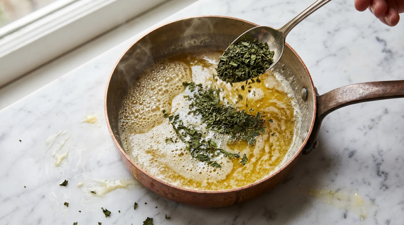 Zamanınız kısıtlıysa ve hızlıca bir menü hazırlamanız gerekiyorsa, eriyen tereyağının içine baştan bir tatlı kaşığı zeytinyağı ilave edin. Bu küçük ve oldukça pratik dokunuş, yağın dumanlanma noktasını yukarı çekerek size birkaç saniyelik değerli bir güvenlik payı sunar. Ancak detaylara takıntılı bir mutfak meraklısıysanız, sıradan market tereyağı yerine mutlaka sadeyağ kullanmalısınız. Sadeyağda su ve süt proteini barınmadığı için, nanenin o kırılgan uçucu yağları çok daha berrak, tatlı ve keskin bir şekilde sosa hapsolur.