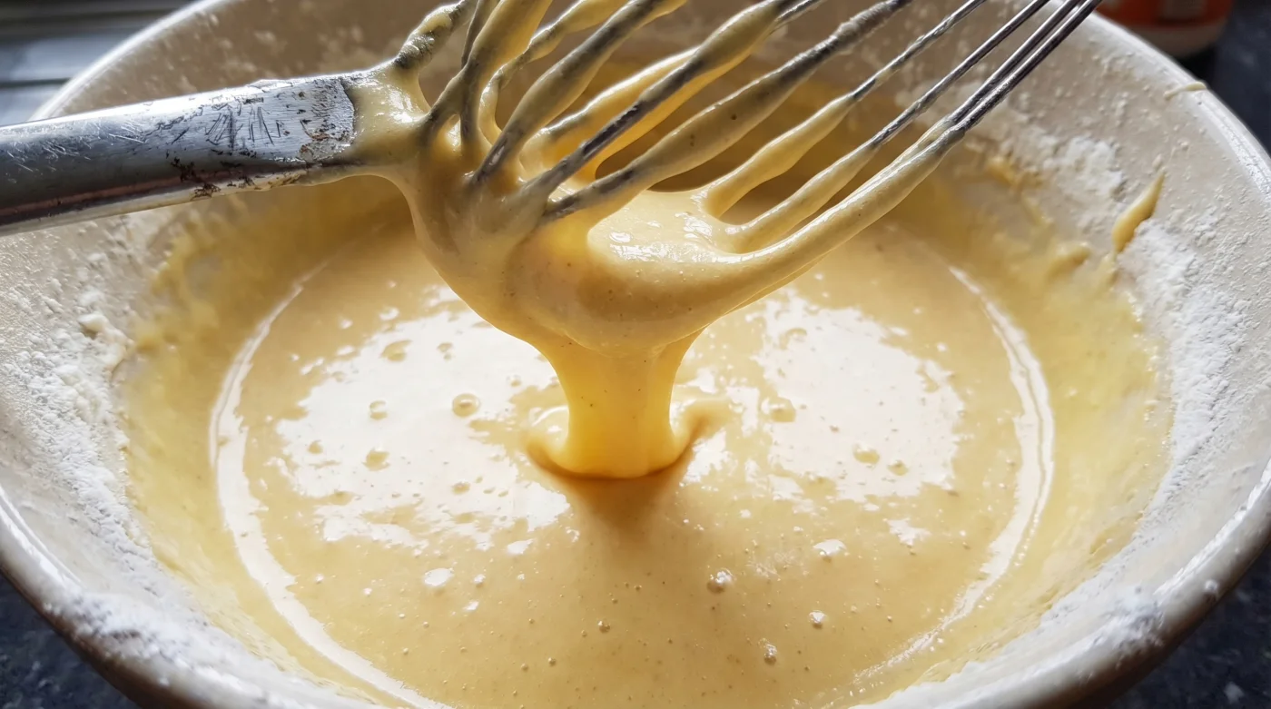 - Sıvı malzemeler eklendikten sonra mikser kullanımını kesin. Hamurun yüzeyinde mat, akışkan ve pürüzsüz kalın bir şerit oluştuğu an karıştırmayı durdurun.