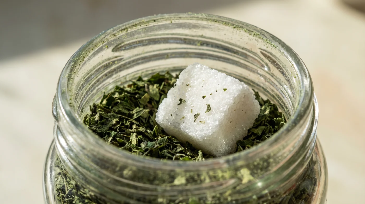 Fiziksel tepkime oldukça nettir; şekerin gözenekli yapısı, ortamdaki mikroskobik su damlacıklarını nane yapraklarından çok daha hızlı çeker. Sukroz kristalleri, nemi sünger gibi emerek feda edilebilir bir bariyer oluşturur. Böylece klorofilin oksitlenip kararmasını engeller ve kavanozun içini çöl kuruluğunda tutar.