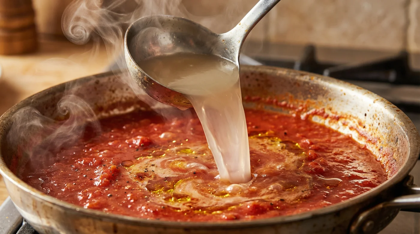Makarnayı süzmek yerine bir mutfak maşası yardımıyla doğrudan fokurdayan sos tavasına alarak süreci kısalt. Üzerine kaynayan tencereden yarım kepçe nişastalı su ekle ve ocağın altını açarak tavayı hızla ileri geri salla. O sıradan ve basit domates sosunun saniyeler içinde nasıl kremsi, parlak bir yapıya büründüğüne inanamayacaksın.
