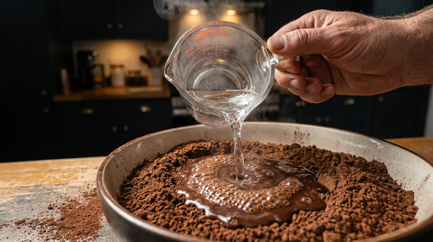 Sadece iyi kalite kakao ve şekerin saf uyumunu arıyorsan, sıcak suyu fırınlamadan çok önce direkt kuru kakao ile buluşturmalısın. Kakaoyu küçük bir kasede yarım bardak kaynar suyla kalın bir macun kıvamına gelene kadar yavaşça çırp. Bu koyu renkli, parlak pastayı daha sonra oda sıcaklığındaki yumurta ve şeker karışımına yedir. Böylece hamurdaki diğer malzemelerin ısısını sarsma riski sıfıra iner, lezzet ise kendi zirvesini bulur.