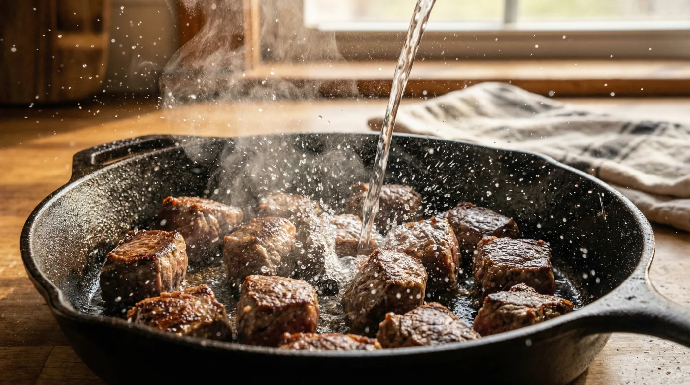 Et kendi suyunu salıp, rengi kahverengiye dönmeye başladığı o kritik anı yakalamalısın. İşte o eşikte, tencerenin tabanındaki ısıyla oda sıcaklığındaki maden suyunun buluşması gerekir. Bu ani şok, etin dış yüzeyini kırmadan iç dokusunu anında yumuşatır.