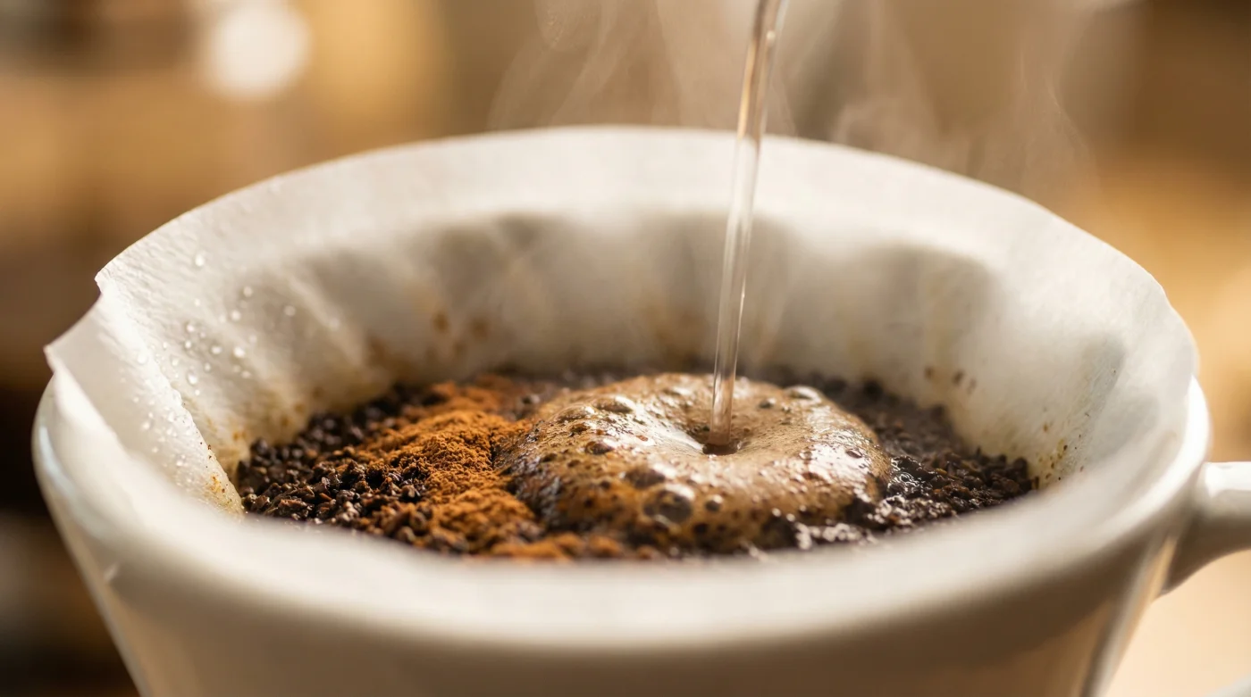 Su, kahveden önce tarçınla temas edip o tabakadan süzülürken, asitlerin büyük bir kısmı filtre kağıdının hemen üzerindeki o kahverengi çamurda kilitli kalır. Fincana düşen sadece en saf, en tatlı kahve özütüdür; o rahatsız edici yanık tortu ise çöpe atılmak üzere filtrede hapsolmuştur.