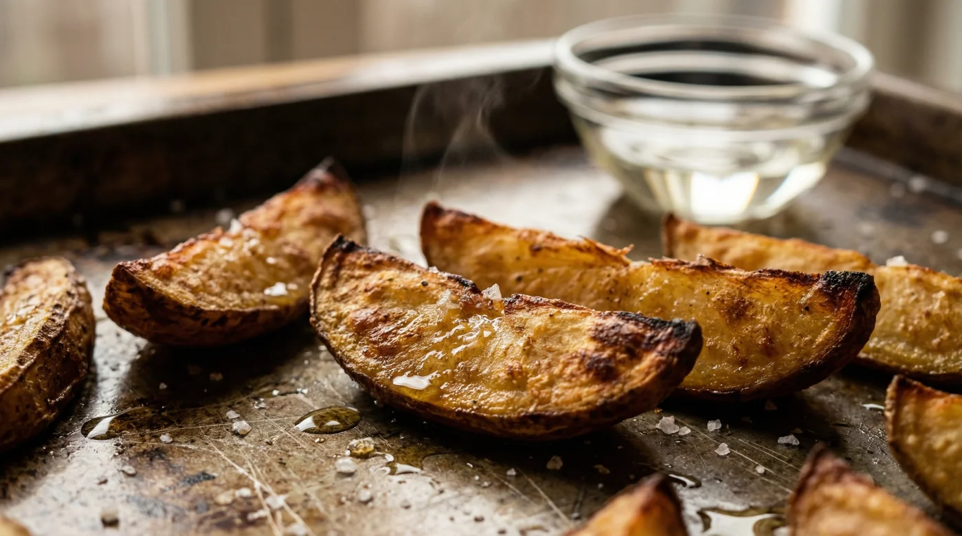 Sirke fırında dağılmayı önleme görevini tek başına üstlenir ve yapısal koruma sağlar. Ancak tuz, patatesin o temel lezzetini içeriye hapsetmek için suya mutlaka eklenmelidir; fırından sonra üzerine serpilen tuz aynı derinlikte nüfuz etmez.