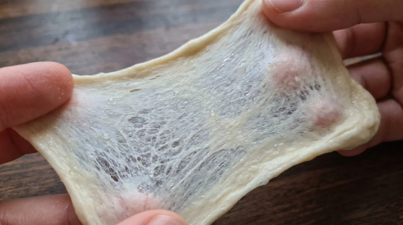 6. Hamurdan ceviz büyüklüğünde bir parça koparıp iki elinizle pencere camı inceliğine gelene kadar esnetin. Eğer hamur yırtılmadan ışığı geçiriyorsa, kusursuz elastikiyete ulaşmışsınız demektir.