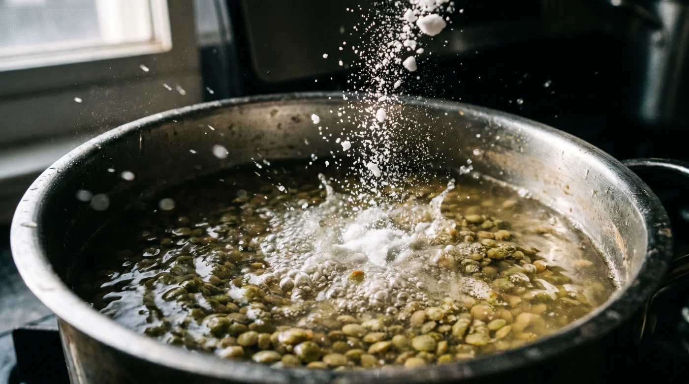 Klasik alışkanlıklar bize kuru bakliyatları sadece bol soğuk suyla ocağa koymamızı söyler. Ancak suyun kimyasal yapısını yok saymak, dar bir elbiseyle maraton koşmaya benzer; içerideki ısı basıncı artar ve dış yüzey en zayıf noktasından yırtılır. Yeşil mercimek zarları ağırlıklı olarak pektin ve selüloz adı verilen dirençli liflerden oluşur. Şebeke suyunuz hafif asidik veya nötr karakterdeyse, tanenin iç kısmı hızla sıvı çekip şişerken dış zar aynı oranda esnemeyi reddeder ve o malum patlama yaşanır. İşte burada sisteme ufak bir müdahale gerekir. Suyun karakterini değiştirmek için devasa oranlara ihtiyacınız yoktur. Suya eklenen çeyrek çay kaşığı (tam olarak 1 gramlık bir çimdik) karbonat, ortamın pH seviyesini hafifçe alkali noktaya çeker. Bu alkali sıvı, pektin bağlarını kontrollü bir şekilde gevşeterek zarın tıpkı esnek bir balon gibi iç dokuyla aynı milisaniyede genişlemesini sağlar.