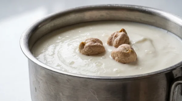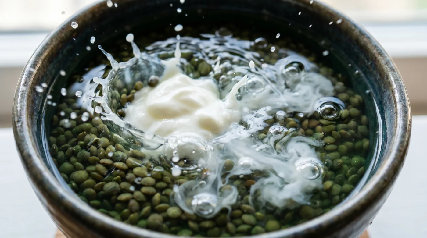 3. Asit Katalizörü: Her bir bardak kuru mercimek için tepeleme bir yemek kaşığı tam yağlı yoğurt (mümkünse ev yoğurdu veya süzme yoğurt) ekleyin. Suyun rengi hafif puslu, sütlü bir dokuya dönüşene kadar metal olmayan bir kaşıkla karıştırın.