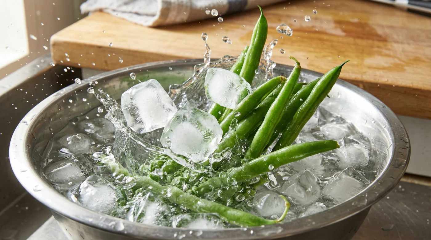 Oysa mutfağına taşıyacağın aniden uygulanan buzlu su banyosu işlemi, bir diğer deyişle şoklama, mutfaktaki en güçlü acil durum frenidir. Fasulyeleri o ölümcül sıcaklığın içinden çekip alıp saniyeler içinde buz gibi bir suyun kalbine daldırdığında, klorofil hücrelerini anında mühürlersin. Hücrelerin içindeki kimyasal tepkime bıçak gibi kesilir; renk solması, o saniyenin binde biri kadar kısa bir sürede donar ve tamamen durur. Bu, doğanın kurallarına mutfakta yapılan küçük ama dâhice bir müdahaledir.