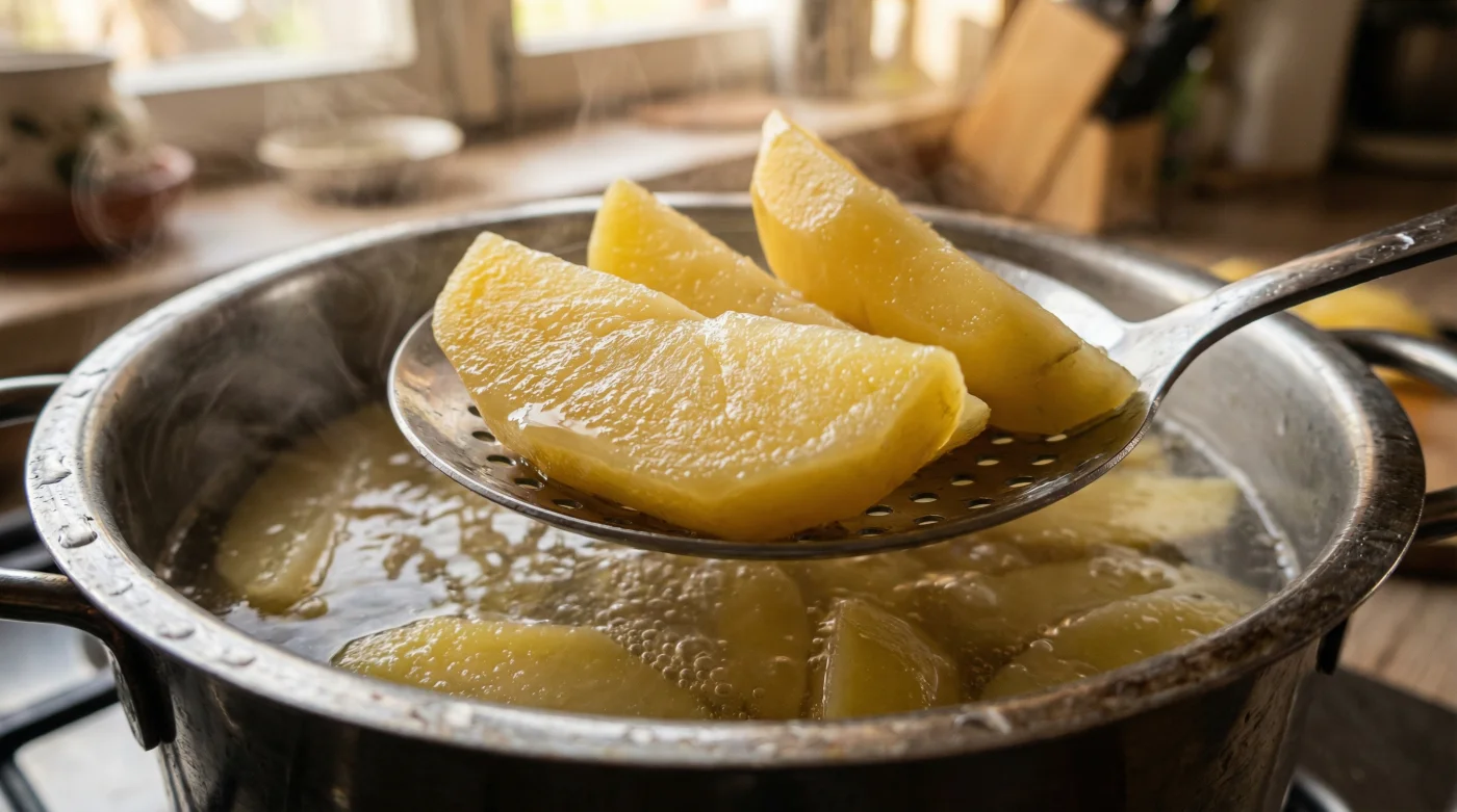 - Haşlama Süresi: Tam 10 dakika. Çatalı batırdığında hafifçe girmeli ama patates kesinlikle ortadan kırılmamalı.