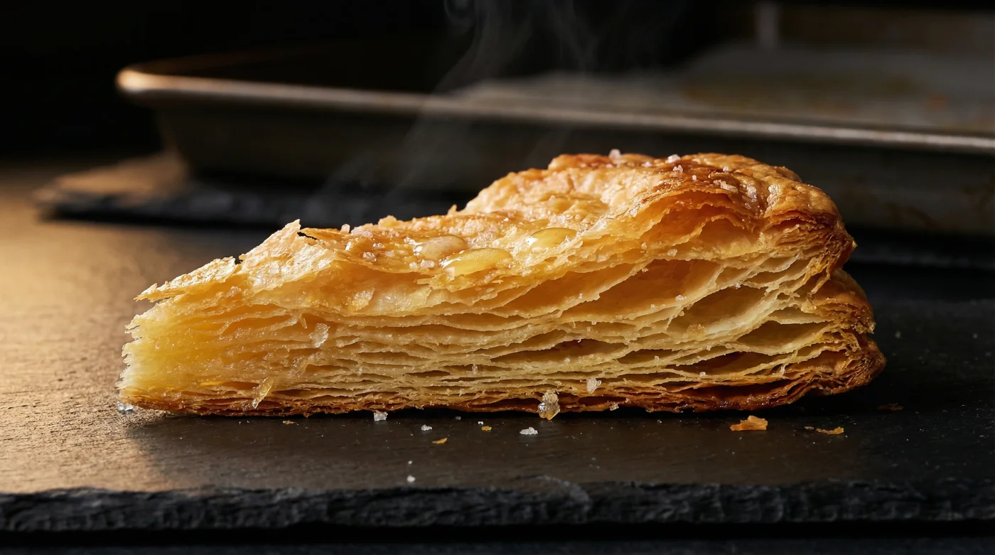 İki fırın tepsisi arasında pişen hamur, dikey olarak büyüyemediği için yatay bir dönüşüm geçirir. Hamurun içindeki su buharlaşmaya çalışırken üstteki tepsinin ağırlığına çarpar. Bu baskı sayesinde tereyağı hamurun dışına kaçamaz; bunun yerine kendi katmanları içinde kızararak yoğun ve karamelize bir çıtırlık yaratır. Havayla dolup boşalan bir hamur yerine, dişlerinin arasında kırılan yoğun bir doku elde edersin.