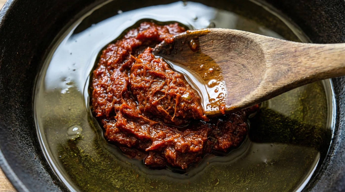 - Ezerek bütünleştir: Ocağı ateşlemeden önce, tahta kaşığın tersiyle salçayı yağın içinde tamamen pürüzsüz, yoğun bir krema kıvamı alana kadar nazikçe ez. Renginin açıldığını göreceksin.