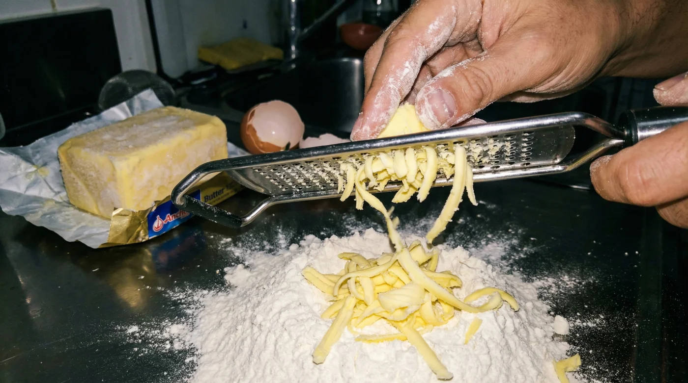 Bu süreç bir güç gösterisi değil, tamamen hız ve zamanlama meselesidir. Ellerini olabildiğince az kullanmalı, malzemelere soğuğun rehberlik etmesine izin vermelisin. Rendelenmiş yağın una eşit dağılmasını sağlamak için, her birkaç rendeleme hareketinden sonra rendelenmiş kısımları una bulayıp topaklanmayı engellemek en harika taktiktir.