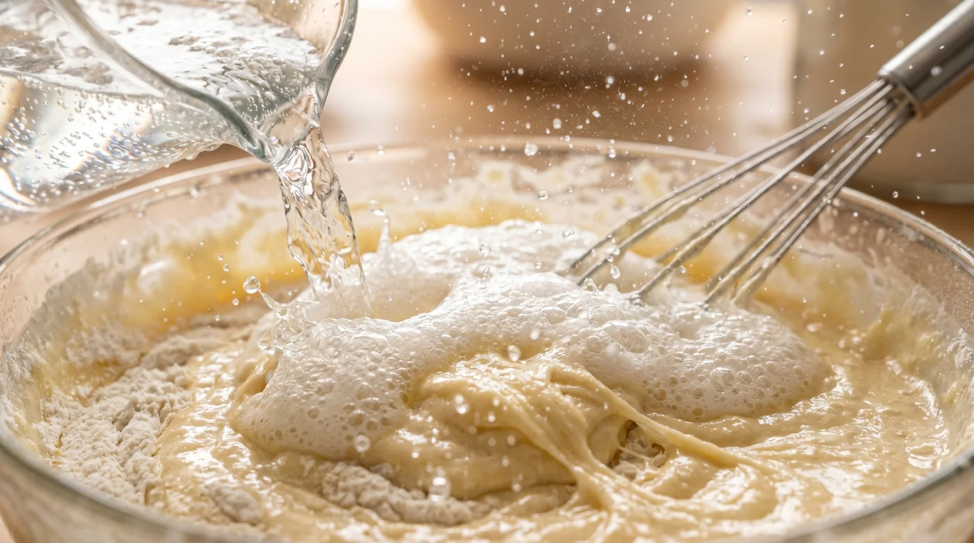 - Maden Suyu Müdahalesi (Şefin Sırrı): Hamur henüz tamamen homojenleşmeden, yani içinde hafif un topakları varken 200 ml oda sıcaklığında sade maden suyunu tek seferde ekleyin.