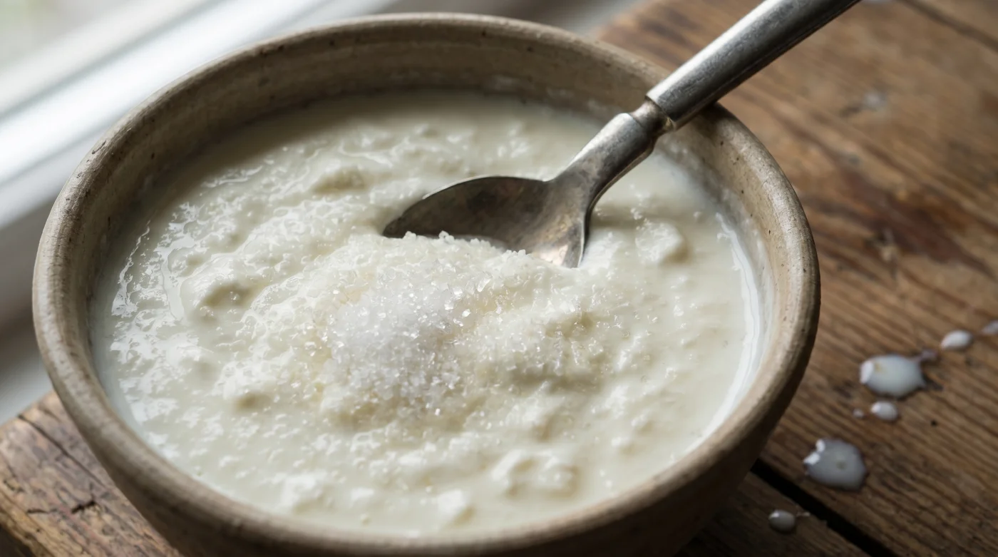 3. Mert Yılmaz’ın Şeker Taktiği: Ayrı bir porselen kasede 2 yemek kaşığı oda sıcaklığındaki maya yoğurdunu alın. Üzerine tam 1 silme çay kaşığı toz şeker ekleyin. Çatalla, pürüzsüz bir krema kıvamına gelene kadar ezin. Şeker kristalleri tamamen sıvı içinde erimeli ve görünmez olmalıdır.