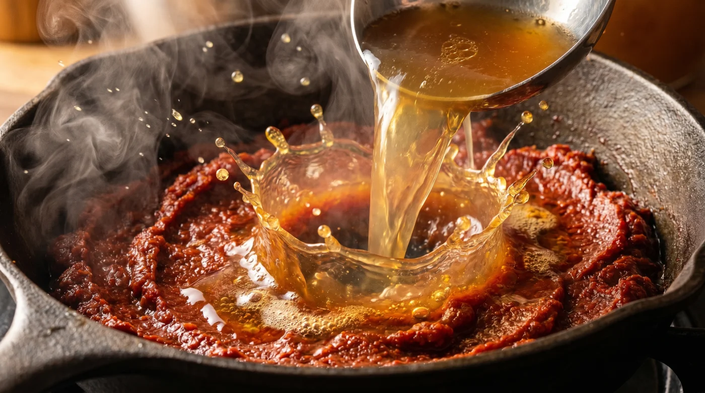 - Söndürme (Deglaze): Salçanın kokusunun o çiğ asitlikten tatlımsı bir kokuya döndüğü o ilk saniyede, oda sıcaklığındaki 1 kepçe kemik suyunu tencereye dök.