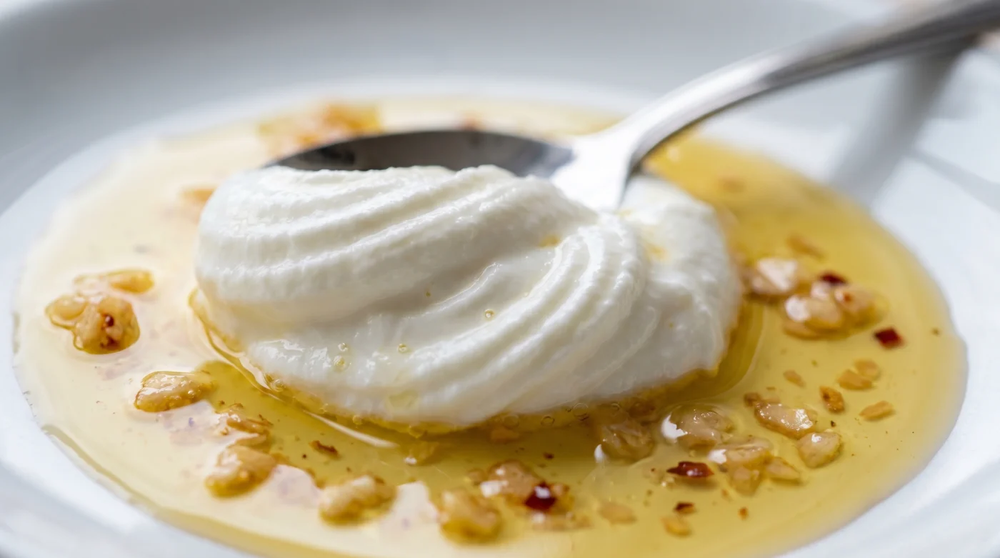 Saf Lezzet Arayanlar İçin: Eğer sadece süzme yoğurt, çok az tuz ve belki üzerine biraz taze nane sunacaksan, zemindeki yağın tamamen pürüzsüz olması gerekir. Sarımsakları bütün olarak zeytinyağında bir gece önceden bekleterek süzdüğün o berrak yağı kullanmalısın. Bu sayede dişte kalan sarımsak parçaları olmadan, sadece o derin, aromatik koku yoğurda alttan alta işler.