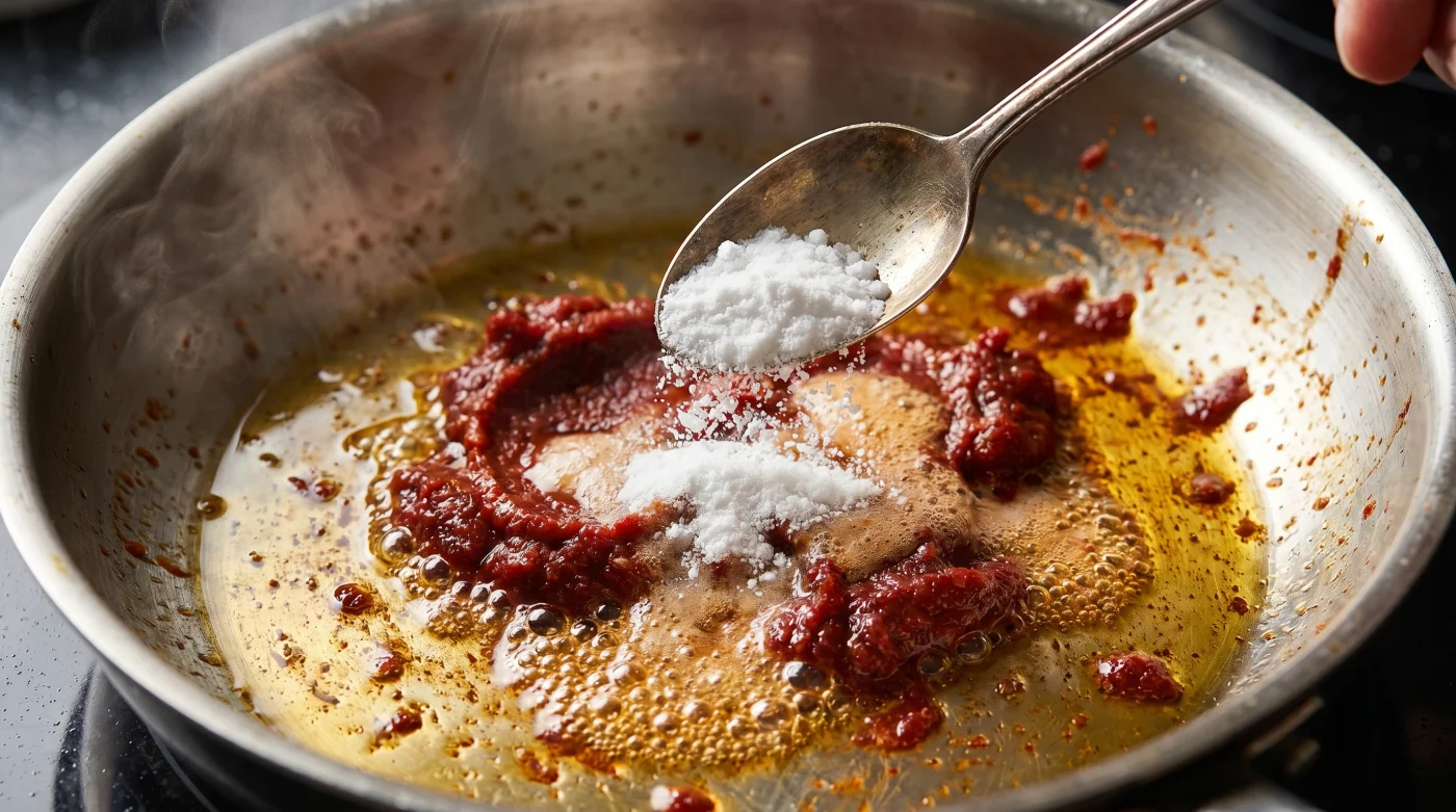 Taktiksel Araç Seti: Bu işlem için ideal tava sıcaklığı orta-kısık ateştir (yaklaşık 140°C). Çok harlı ateş karbonatın anında yanmasına sebep olur. Kullanacağın ölçü maksimum ¼ çay kaşığıdır, bir kilo salça için bile bu miktar yeterlidir. Daha fazlasına asla ihtiyacın yok.