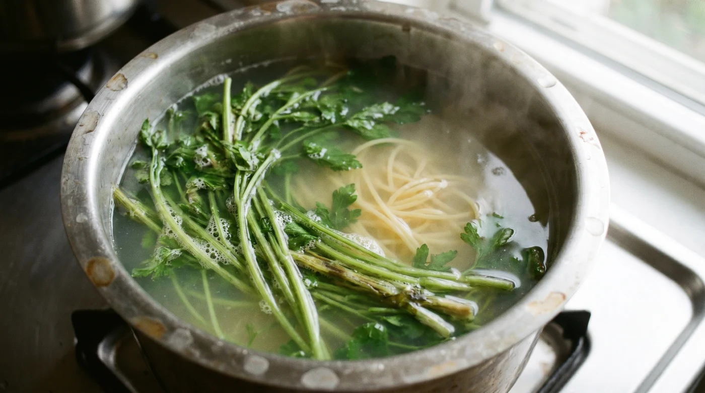 Yoğun Hafta İçi Telaşındakiler İçin: İşten yorgun argın geldin ve dolapta sadece biraz salça ile kuru makarna var. Çekmecedeki solmaya yüz tutmuş maydanozların saplarını kopar ve doğrudan haşlama suyuna at. O basit salçalı makarna, sanki saatlerce ocakta tıngırdamış bir sebze suyuyla pişmiş gibi zengin bir derinlik kazanacaktır.