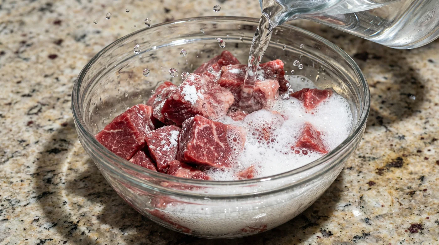 Aşağıdaki adımları uygularken, etin yapısındaki o anlık, mucizevi değişimi parmak uçlarınla hissedeceksin. Soğuk suyu hazırladığında, karbonatın suyun içinde tamamen, tortusuz bir şekilde çözündüğünden emin olmalısın. Suyun berraklığı ve pürüzsüzlüğü, alkali etkinin her bir et parçasına eşit dağılması için ilk ve en temel şarttır.