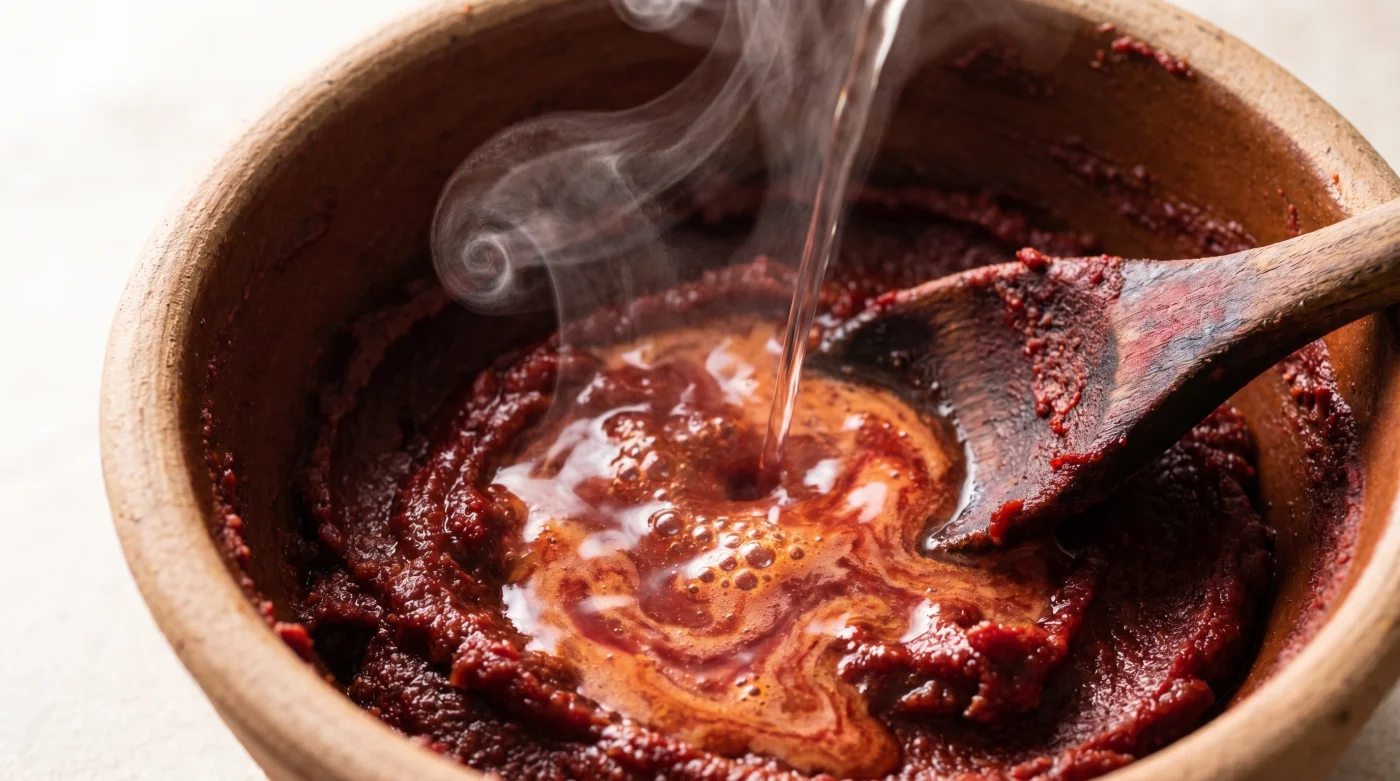 O yoğun, kırmızı macunu kızgın bir tavaya hapsetmek yerine, önce küçük bir kasede ılık suyla şefkatle çözmek, tüm kimyayı değiştirir. Sıvıyla gevşeyen domates dokusu, yağla buluştuğunda yanmak yerine yavaşça terlemeye, içindeki asidi usulca buharlaştırmaya başlar.