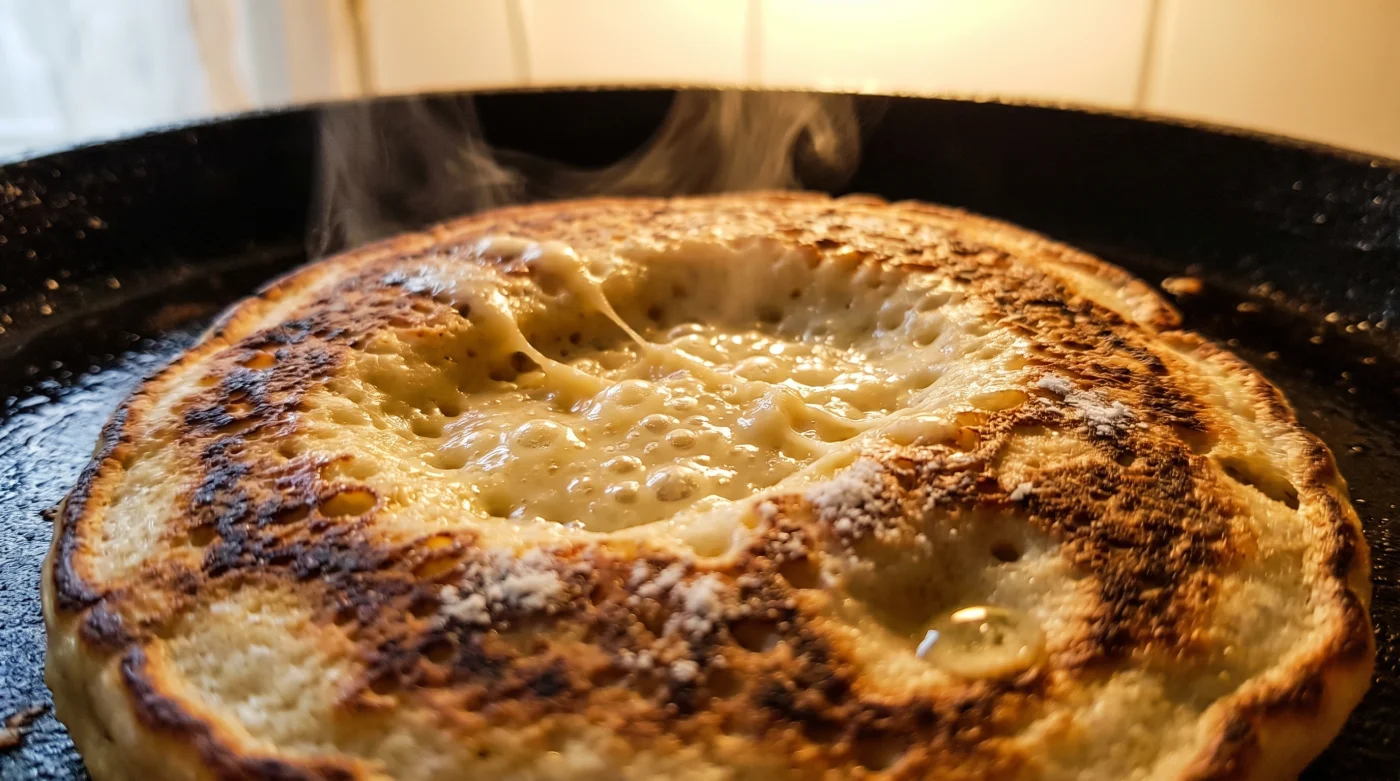 - Tek hamlede çevir: Hamurun kenarları matlaştığında, spatulayı kararlılıkla altına sok ve hiç tereddüt etmeden, bilekten gelen yumuşak bir hareketle çevir.