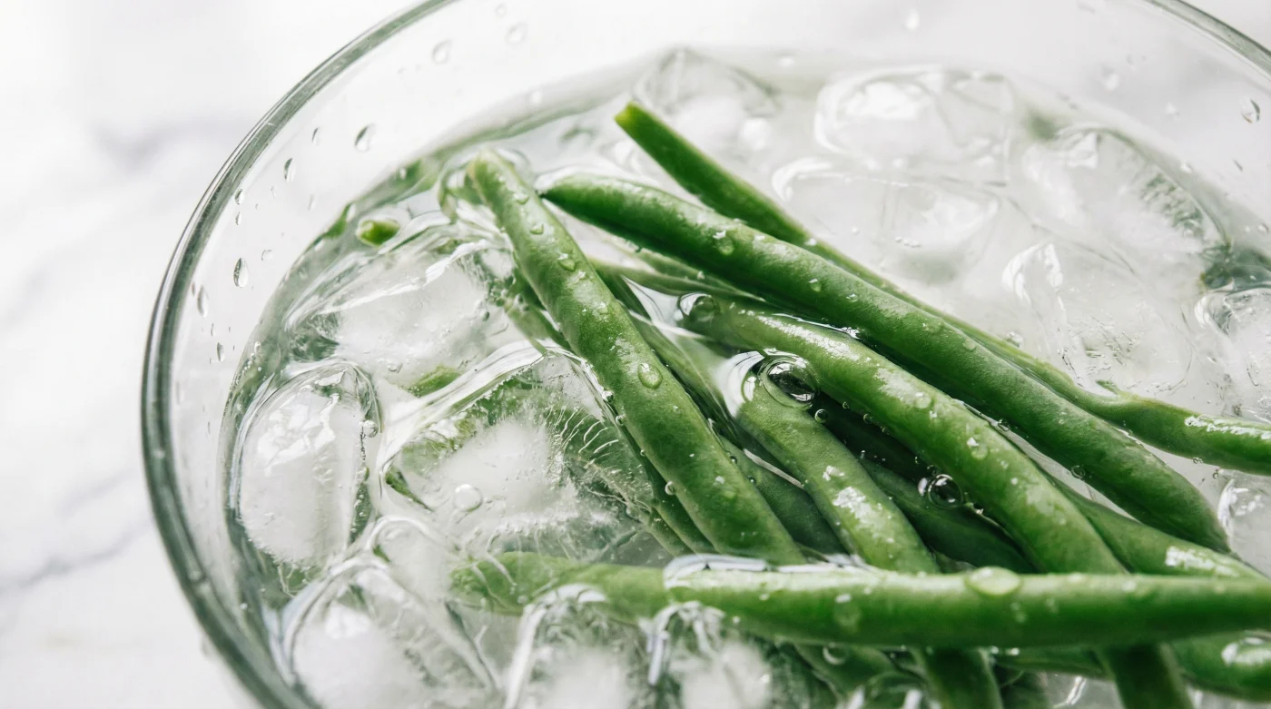 İçi buz küpleriyle dolu bir kase soğuk su ise, o bisikletin önüne aniden çekilen kalın ve yumuşak bir güvenlik ağıdır. Fasulyeleri kaynar sudan çıkarıp doğrudan bu buzlu suya attığında, hücresel düzeydeki tüm o kaosu saniyesinde dondurursun. Isı sıfırlanır, asitlerin klorofile saldırması engellenir ve o lokanta yeşili, sebzenin dokusuna kelimenin tam anlamıyla kilitlenir.