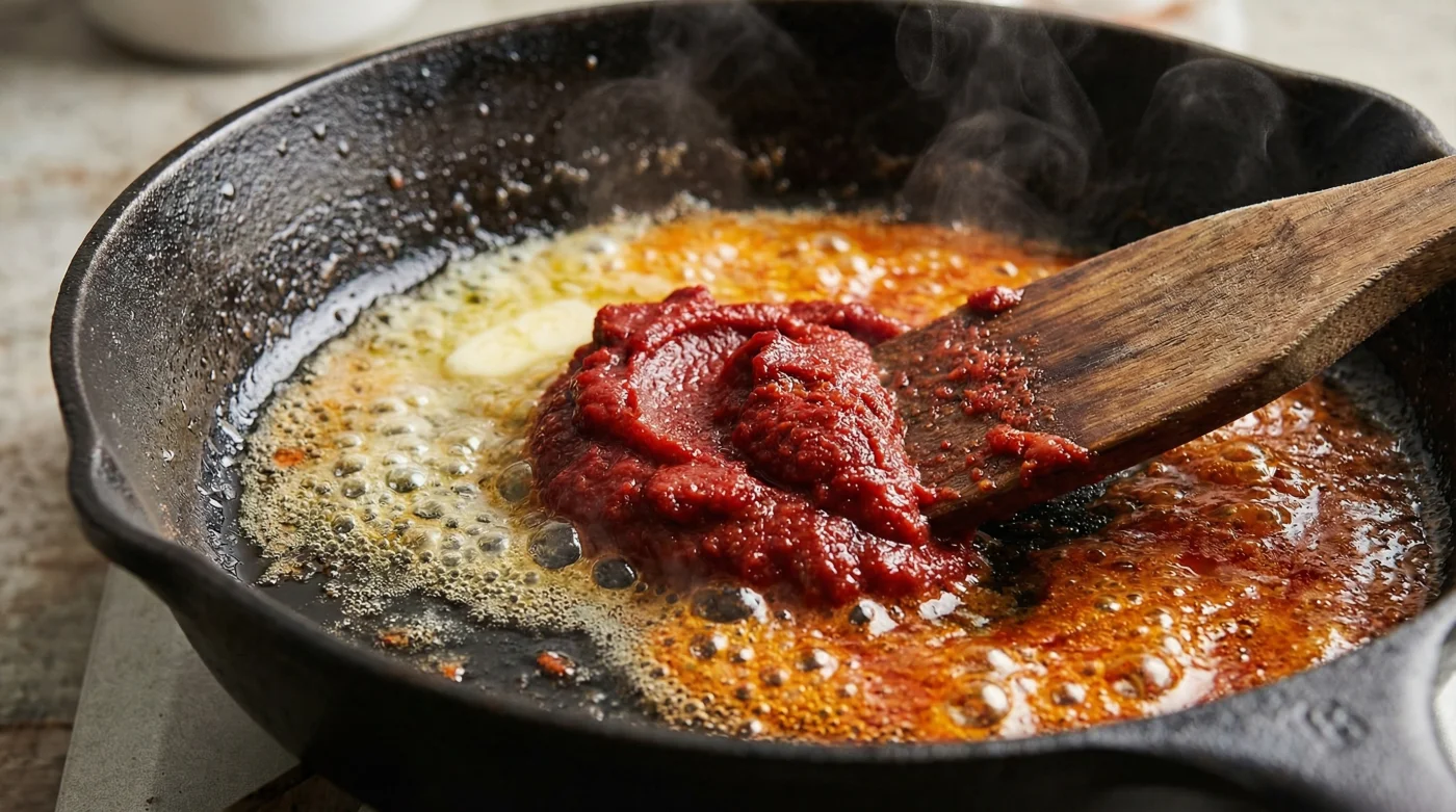 Tereyağı ise doğası gereği çok daha bağışlayıcıdır; hem yağ hem de bir miktar su ve değerli süt proteini içerir. Tencerede usulca eridiğinde tabanda adeta koruyucu, emülsifiye edici bir köprü kurar. Salçayı sıvı yağın o keskin ve agresif sıcağında yakmak yerine, onu tereyağının yumuşak bir şekilde köpüren süt proteinleriyle sararsın. Bu nazik kucaklaşma, likopenin hücre duvarlarını parçalamadan yağa geçmesini sağlar; tabaktaki renk cansız bir turuncudan kan kırmızısına dönerken, tat asidik bir köşeden çıkıp karamelize bir derinliğe yerleşir.