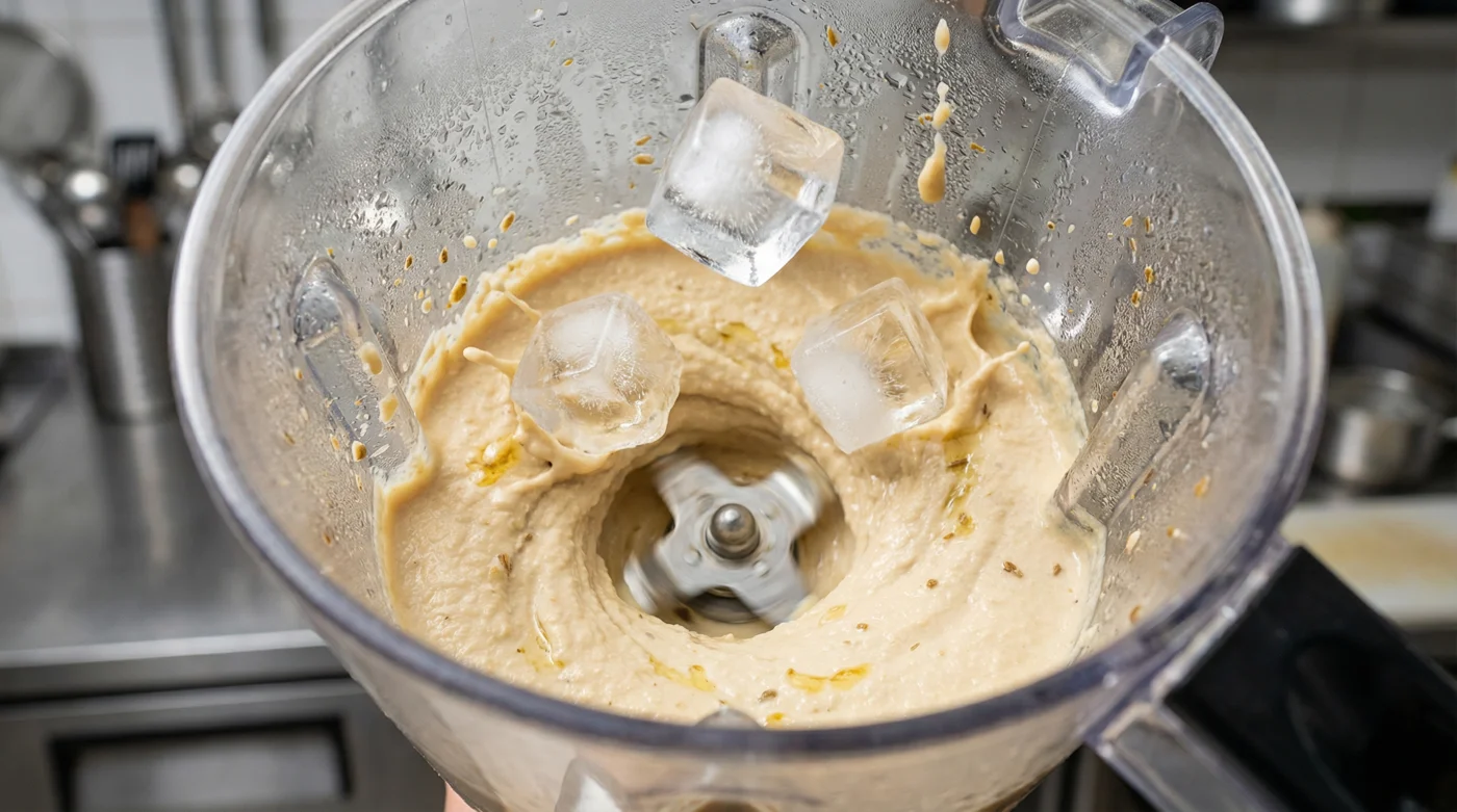 İşte tam bu noktada oyunu değiştiren şey bir termal şoktur. Yüksek hızda dönen o sıcak girdabın içine sert ve dondurucu buz küplerini attığında, sistem aniden sarsılır. Buz, tahin, limon ve sarımsaktan oluşan o sıcak emülsiyonu saniyeler içinde soğutur. Bu ani soğuma, yağların ayrışmasını engeller ve nişastanın yapışkan bir hamur olmak yerine incecik bir kremaya dönüşerek havayı içine hapsetmesini zorunlu kılar. Havasız ve basık bir odadan çıkıp kışın o sert, soğuk nefesini ciğerlerine çekmek gibidir; her şey aniden berraklaşır ve açılır.
