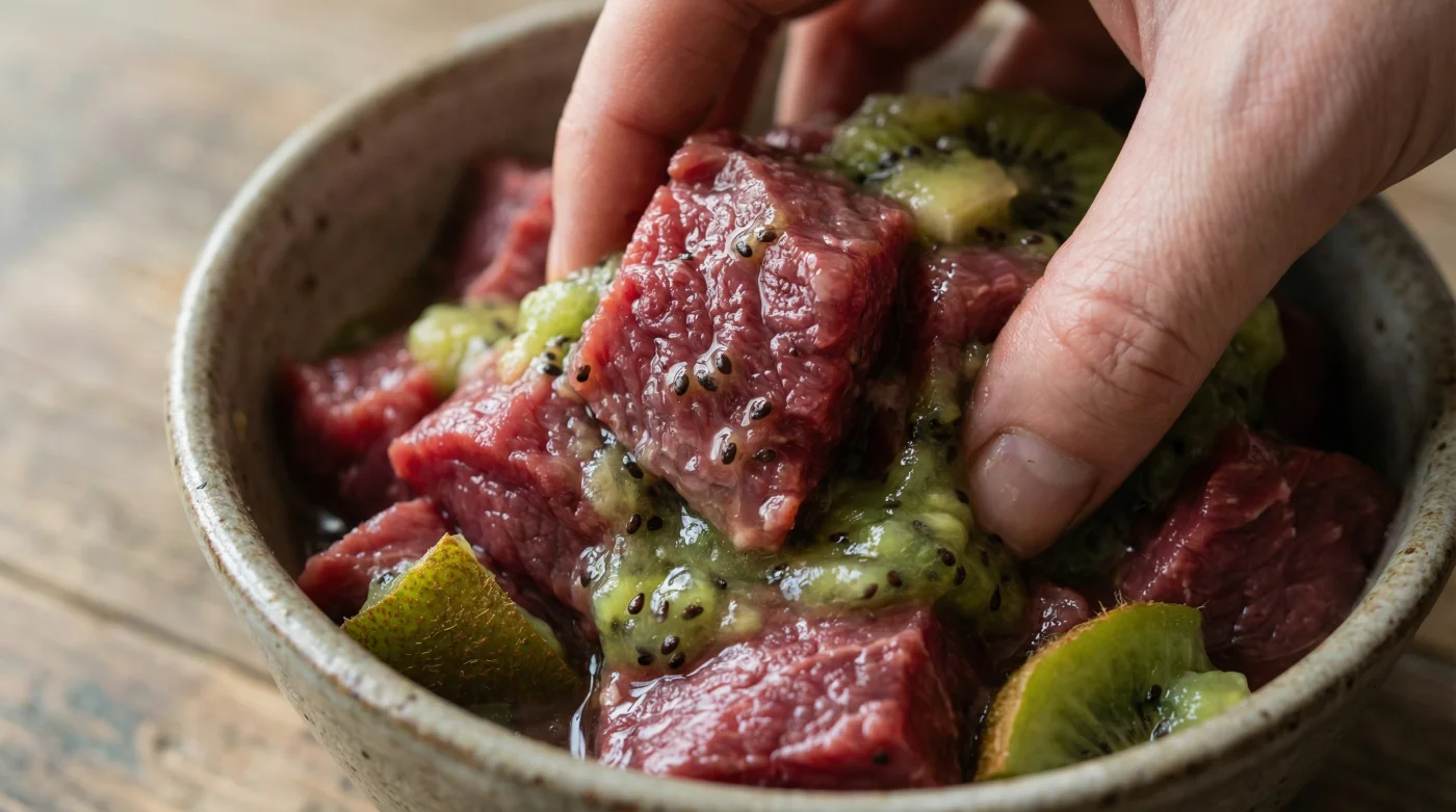 2. Kivi püresini etin üzerinde 15 dakikadan fazla bekletirsem ne olur? Aktinidin enzimi çok güçlüdür; süreyi aşarsan etin dokusu tamamen parçalanıp peltemsi, istenmeyen bir kıvama dönüşür.