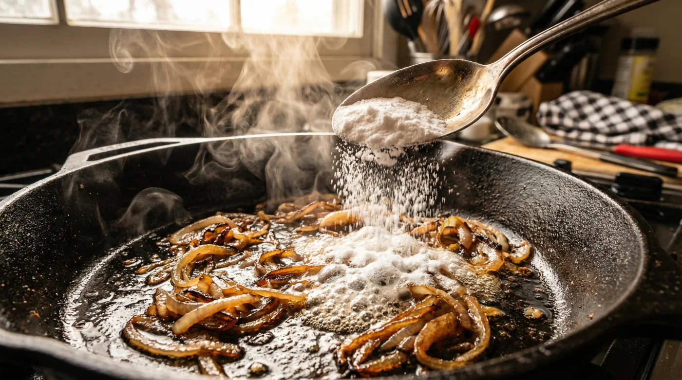 İşte tam bu noktada o basit mutfak hilesi devreye girer. Tavaya atacağın çeyrek çay kaşığı karbonat, ortamın pH dengesini saniyeler içinde değiştirir. Karbonatın alkali yapısı, soğanın asiditesini nötralize ederek o yokuş yukarı yolu, dümdüz ve pürüzsüz bir otoyola çevirir. Hücre duvarları hızla esner, içlerindeki doğal şekerler tavanın sıcak yüzeyine süzülür ve o saatlerce beklediğin karamelizasyon dakikalar içinde tüm tavanı sarar.