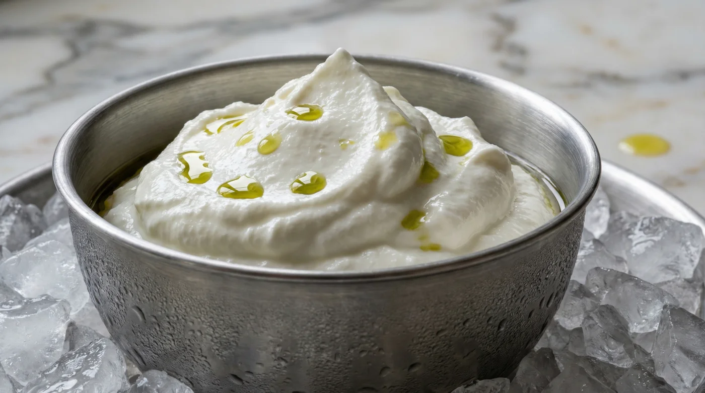 Buz banyosu, zeytinyağının o akışkan asabiyetini yoğurdun uysallığıyla dondurup eşsiz, sarsılmaz bir dokuya hapseder.