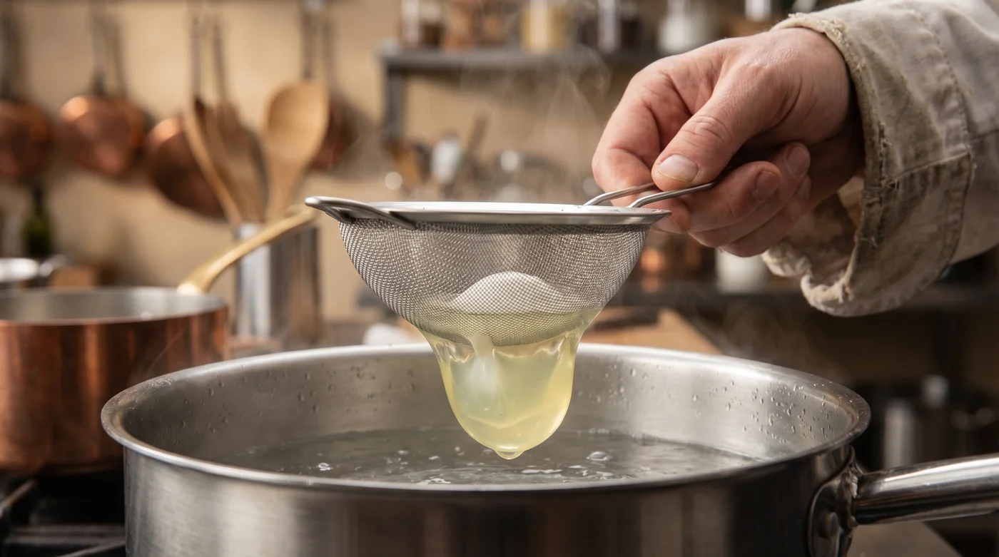 Süzme işlemi için tam olarak ne kadar süre beklemeliyim? Genellikle on beş ila yirmi saniye arası yeterlidir; o su gibi akan kısım hemen ayrılır, geriye sadece pişirilmesi gereken asıl tok beyaz kalır.