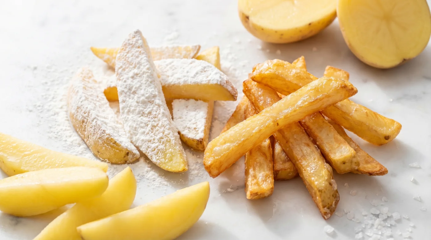 Patatesin yüzeyindeki o hafif ıslaklığı bir tür taze inşaat harcı gibi düşün. Mısır nişastası ise o harcın üzerine sımsıkı tutunan mikroskobik, hafif tuğlalardır. Yağın yüksek ısısıyla temas ettikleri o ilk saniyede, bu karışım anında mühürlenir ve kırılamaz, sert bir zırh oluşturur. İçerideki hapsolmuş buhar kendi kendine, nazikçe patatesin içini pişirmeye devam ederken, dışarısı adeta ince bir porselen tabakasına dönüşür. Çıkan sonuç; dışı zırh gibi korunaklı, içi ise adeta bulut gibi yumuşak bir tezatlıktır.