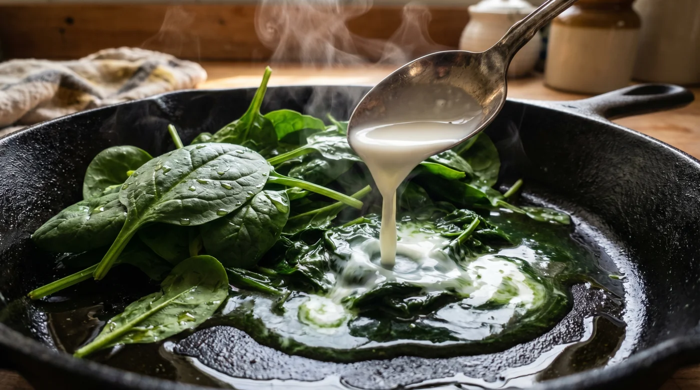 - Sihirli Dokunuş: Ispanaklar sönüp o koyu renkli suyunu hafifçe saldığında, tam o anda oda sıcaklığındaki iki yemek kaşığı sütü ilave et.
